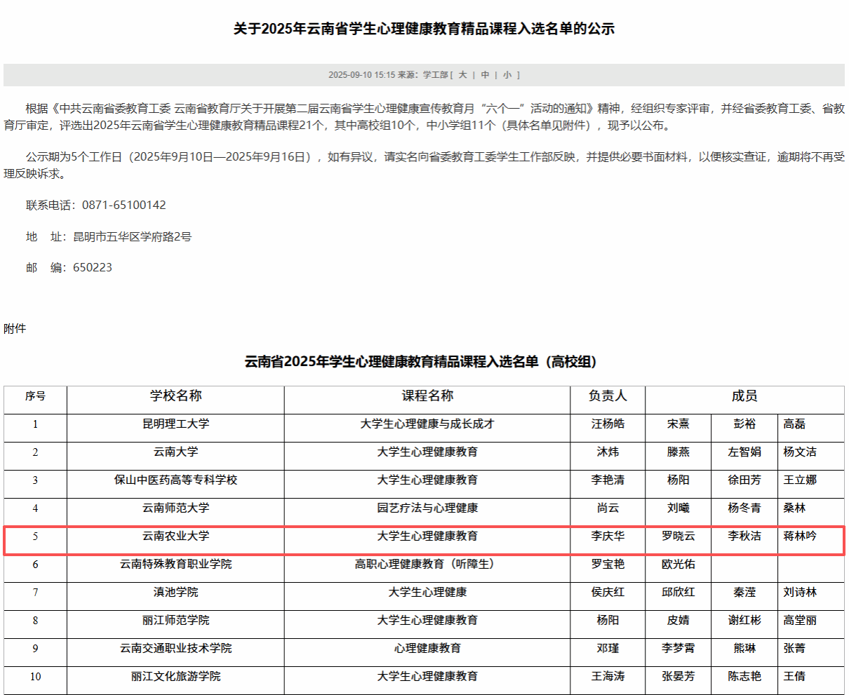 本站消息 近日,中共云南省委教育工委、云南省教育廳對2025年云南省學生心理健康教育精品課程入選名單進行公示,學校《大學生心理健康教育》課程成功入選高校組精品課程。